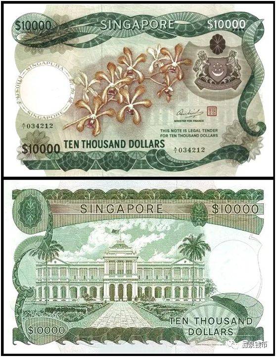 10000 元币的正面主景图案为 "胡姬花",背面主景图案为大楼,票幅为 20.3 × 13.3 厘米,主色调为绿色。