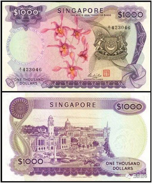 1000 元币的正面主景图案为 "胡姬花",背面主景图案为新加坡维多利亚纪念堂和皇后宫,票幅为15.9× 9.5厘米,主色调为紫红色和深灰色;