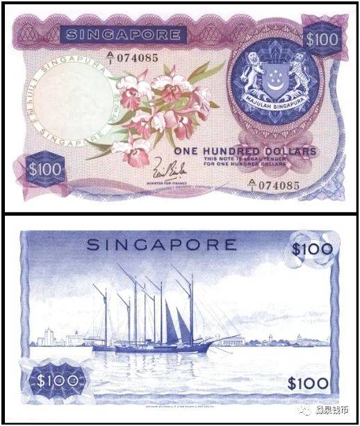 100 元币的正面主景图案为 "胡姬花",背面主景图案为新加坡水域的和平景象,票幅为15.9× 9.5厘米,主色调为蓝色和紫红色;