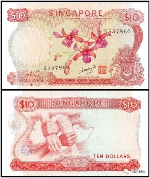 10 元币的正面主景图案为 "胡姬花",背面主景图案为以新加坡版图为背景的四只紧握的手,票幅为13.3× 7.9 厘米,主色调为红色;