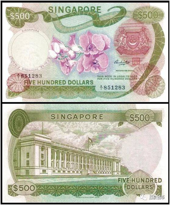 500 元币的正面主景图案为 "胡姬花",背面主景图案为政府办公大楼,票幅为16.0× 9.6厘米,主色调为绿色;