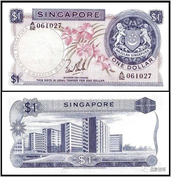 1967年6月12日,新加坡发行了第一版新加坡元钞票,印有胡姬花(兰花)图案,发行面额为1元,5元,10元,50元,100元,1000元,后于1972年增加25元及500元钞票,又于1973年发行10000元钞票。(1967-1976)