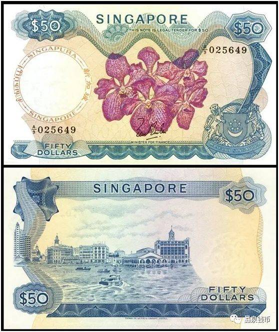 50 元币的正面主景图案为 "胡姬花",背面主景图案为新加坡滨海区和克里福德码头,票幅为14.6× 8.7厘米,主色调为蓝色;