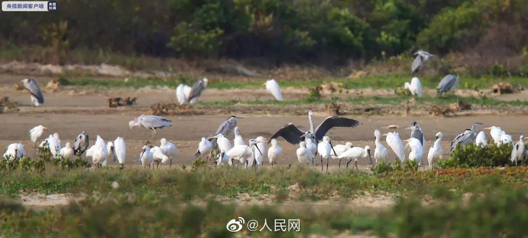 广东阳江海陵大堤湿地,60只全球第二濒危的水禽黑脸琵鹭,也翩翩而至。
