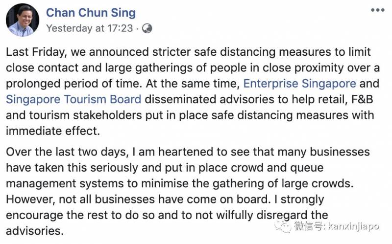 在3月20日,新加坡卫生局发布了最新社交距离政策,减少人与人之间的接触,取消了许多大型活动。同时新加坡企业发展局和新加坡旅游局也推行了一系列防范措施,建议餐饮、零售、旅游业采取。