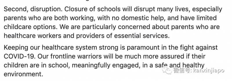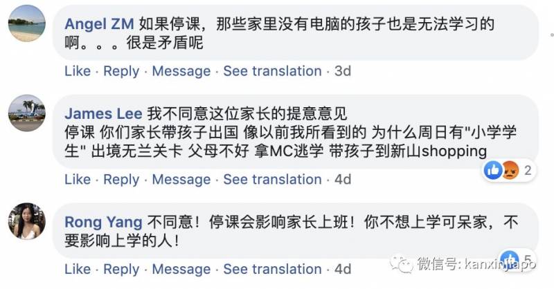 (新加坡眼脸书贴文)现在这种非常时期,作为父母担心孩子的健康也是很正常的,但也有家长表示不支持停课,因为父母必须工作,没时间在家照看孩子。