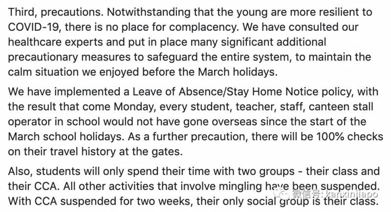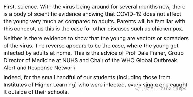 我个人回答了许许多多的父母和学生们,其实,边界加强措施的一部分也是为了保障新加坡的安全,只有这样,大家才能有如往常的上班,上课。可是也让我解释为什么教育部会开学的原理,并于更多多保护措施实行当儿,开学的原理有三个主要考量色素。第一, 冠状病菌已存在了几个月的时间,按照科学原理和研究资料,冠状病菌对于年轻人的影响相对的比大人们小,有如出水痘类似的原理,父母应该对这非常的了解. 根据国大医院集团董事,国际健康主旨全球疫情警报和响应网络主席,戴尔·费舍尔博士的建议,并没有年轻人促进病毒传染的类似证据并正好相反,年轻人大多数都是被在家里的成人感染的。的确,当地少数被感染的学生们【包括高等学习学院的学生们】都是在学院外面被感染的。根据这原理,让孩子们每天大多的时间再学校上课也不见得是件坏事。学校一天上课和行程的安排让他们只和同学们互动,作为一组比大人比较不易受冠状病毒影响的人,他们也比较容易抵抗病菌。如果我们把学校关了,许许多多的学生或许不会呆在家里,反而会往外跑并且与更多其他人互动,增加了他们的感染机会。根据着理论,学校还是一个非常安全的地方,尤其因为年轻一代比较不受冠状病毒影像的原理。第二, 如果把学校关了,许许多多的人都会受影响,尤其是托儿方式有限,没有可以帮忙照顾孩子们,在工作的双亲。我们对于是医护人员和基本服务提供人员的父母是非常的在意。维持我们健康设施在这对抗冠状病毒的期间非常重要,如果孩子们在一个非常安全,健康的环境下学习著,我们的前线医护人员也会比较放心。第三, 预防,虽然说年轻人比较不容易受冠状病例的感染,我们也不会就这样卸下防备,询问了许许多多的医护专家之后,我们加强了防范措施来确保系统的安全,让我们拥有在三月假期之前的安宁。有了休假和家休的对策,所有学生们,老师们,贩卖食物的食堂人员,应该都是在三月休假时没出过国,可是作为万一,我们会在校门前询问所有学校进出人员的出国史例。而外,学生们只会和两组人马互动,他们上课的同班同学们,还有课后活动的同学们。其他而外的交流活动都被终止,课后活动也休止两周,这么一来,他们只有和同班同学们接触。另一个防范措施就是,每天早上,如果有学生生体不适,不仅是发烧,就算咳嗽还是喉咙不舒服,都会被隔离还是送回家。上课的期间,学生们会和考试期间一样对每位学生都有一小段距离,老师们,学生们,都会相对措施并保持最高的卫生水平。较年轻的学生们会有人监视著,提醒他们要好好洗手,并且常洗手,也同时提心他们别触摸脸。一起实行的这些防范措施会是补充著年轻人以有对冠状病例的抵抗力,让学校能够继续下去。