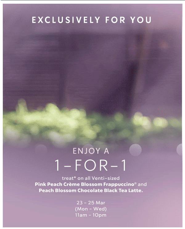 Valid from 23 – 25 Mar 2020 (Mon-Wed), 11am – 10pm only on Venti-sized Pink Peach Crème Blossom Frappuccino and Peach Blossom Chocolate Black Tea Latte (hot, iced or blended) at all Starbucks Singapore stores (except for stores located at Changi Airport including Jewel).
