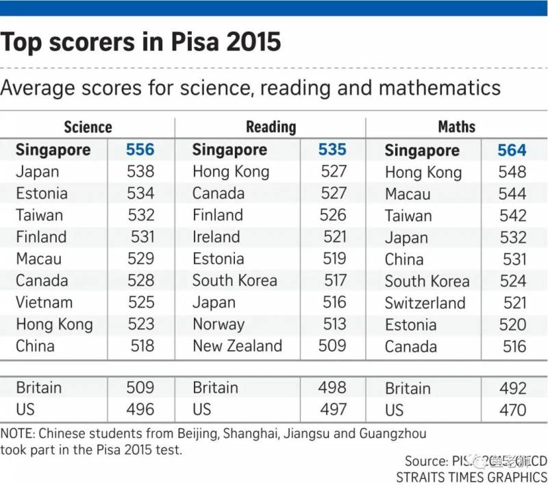 相应的,新加坡的学生素质,在世界竞争中也是名列前茅。根据2015年经济合作与发展组织所发起的“学生能力国际评估计划”,通过对新加坡全国随机抽取的六千余名学生进行测试,新加坡学生在科学,阅读和数学方面具备明显优势。