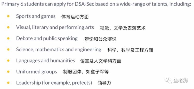 另外,各个中学和初级学院还开通的直接收生计划DSA(Direct School Admission),即在各方面有特长和天赋的学生可以直接申请,学校针对该方面进行考核,然后直接入学。这对在体育等方面有特长的学生是一个好消息。