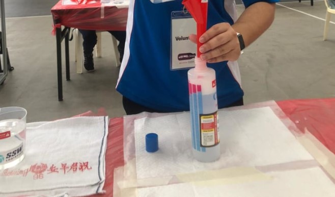 这款免洗消毒液不含酒精,不会刺激皮肤,因此在义顺东的民众俱乐部,下午2点多,就有不少民众,在基层领袖和新加坡博彩公司义工的引导下,前来排队领取。