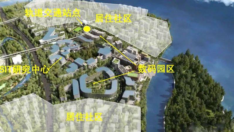 以两个轨道交通站点为核心延伸出一条带状的数码园区,与南侧的SIT研究中心形成完整的数码园区。在园区的两翼,形成两片大的居住区。