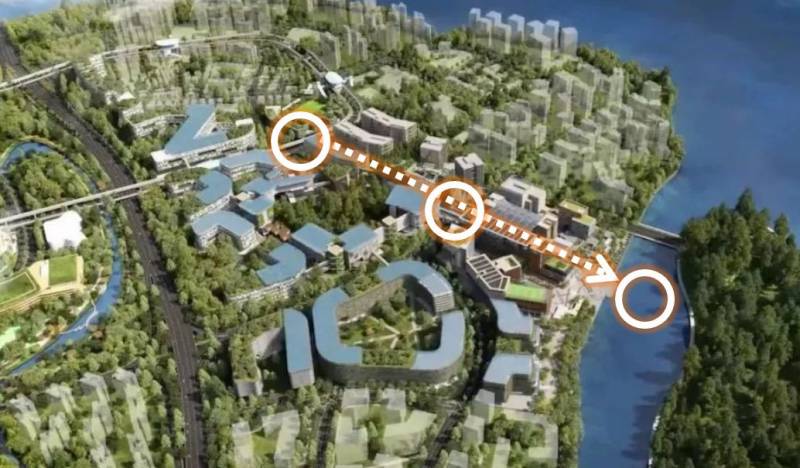2.两个轨交站点带动的智慧城市数码园区位于市镇的东北部,在一条通往新加坡主城区的轨道交通的起点处。这个轨交站点对于区域有着非常重要的作用。在详细的方案设计中,设计师也是围绕着2个TOD站点,延伸出居住、研发、商业、办公等功能。而大片区看,这个新市镇是一座功能完备的智慧城市。