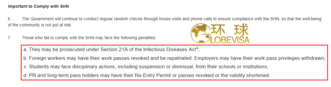 同时新加坡移民局也明确表示:不遵守新加坡居家隔离(Stay Home Notice)要求的人可能面临以下惩罚: