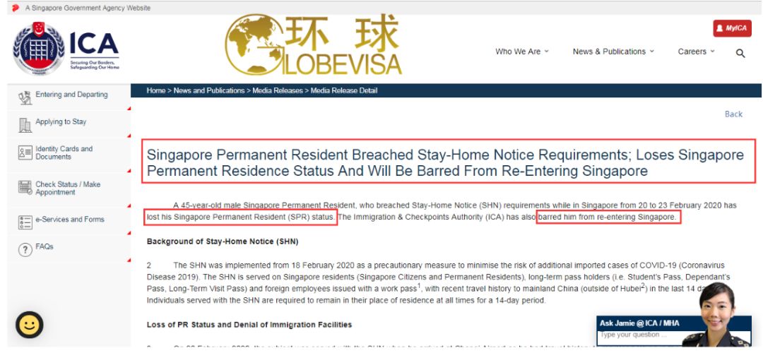 根据新加坡移民局ICA官网最新通报:一名45岁男性新加坡永久居民在新加坡期间(2020年2月20日至23日)违反了新加坡居家隔离(Stay Home Notice)要求,从而被取消了其新加坡永久居民身份,新加坡移民局也将永久禁止其入境新加坡。