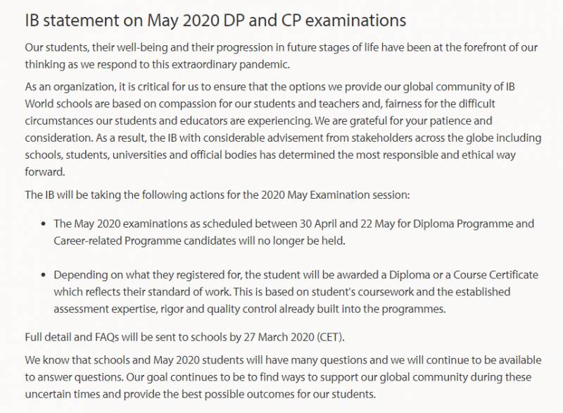 IBO取消2020年5月的IB DP考试的决定已经做出,