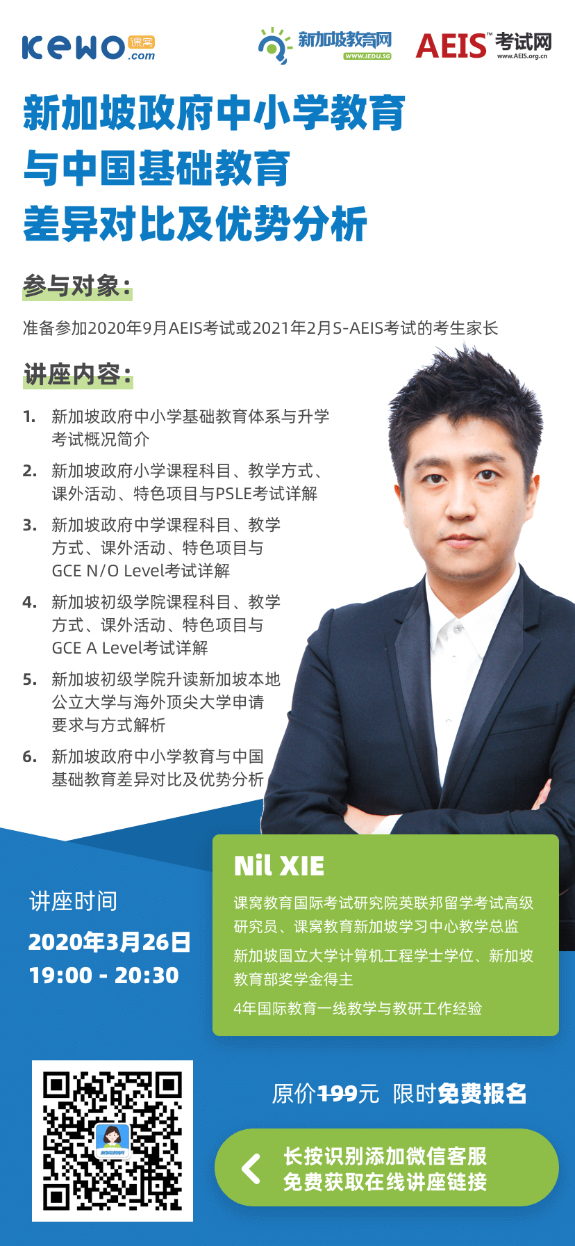 3月26日晚,我们将有一场公开课为大家答疑解惑,带您解析新加坡政府中小学教育与中国基础教育差异对比优势: