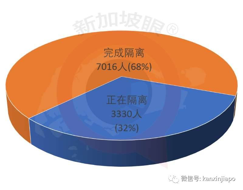 新加坡完成隔离者有7016人,占总隔离数68%,正在隔离者3330人,占32%。