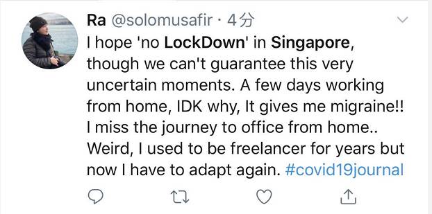 “我不希望封国,虽然在这种不稳定的时刻,我们也不能保证。但不知道为什么,才在家工作几天我就已经偏头痛了!!实在是想念去办公室的日子啊......”