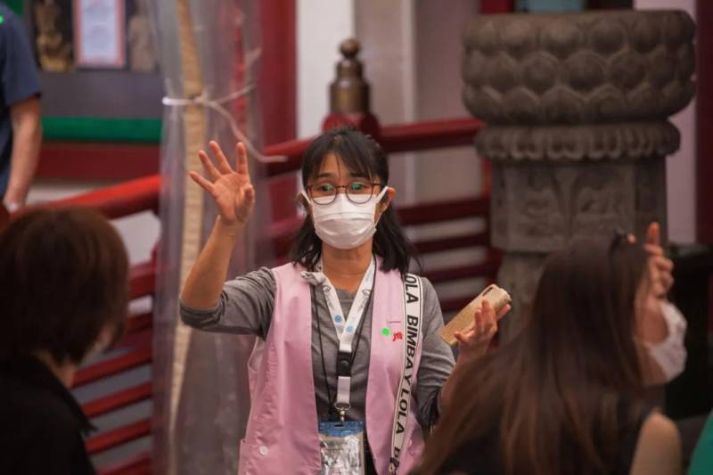 2020年2月,在新加坡牛车水唐人街附近寺庙组织游客参观的工作人员 | SOPA Images Limited / Alamy Stock Photo