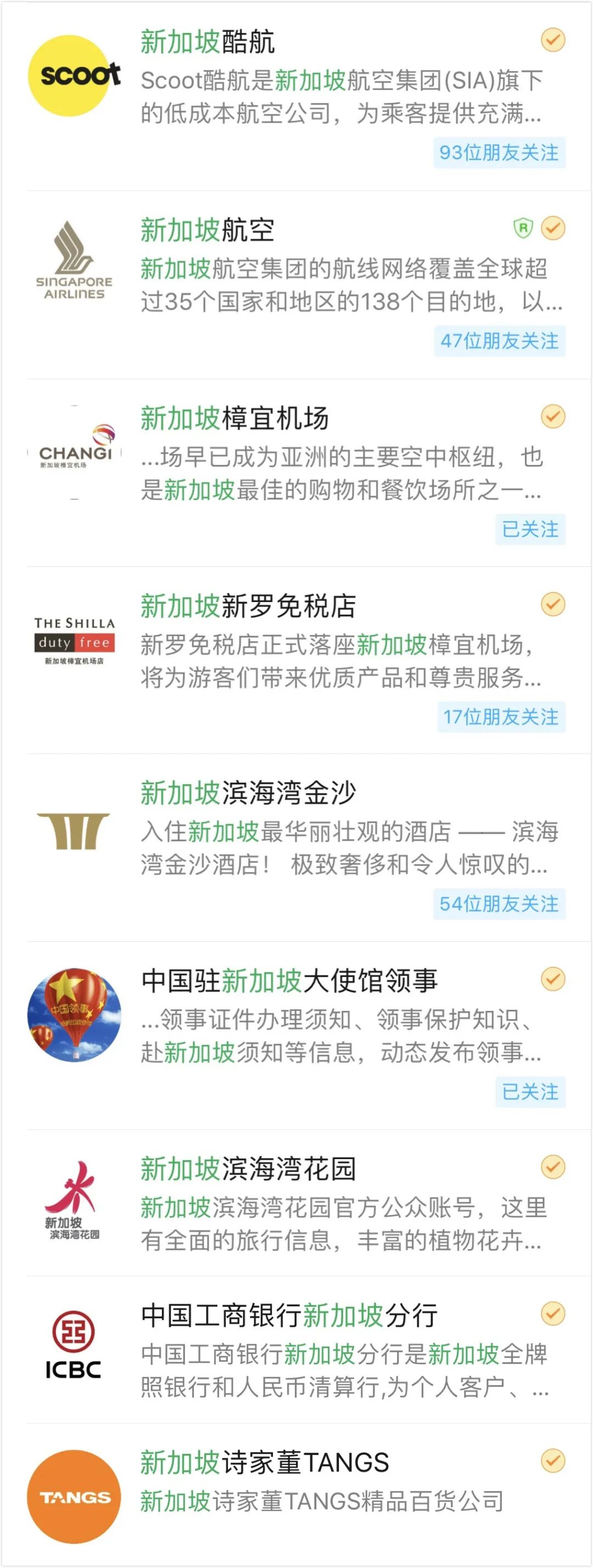 新加坡企业公众号,涉及航空、零售、酒店、景点、银行,甚至是大使馆这样的组织。