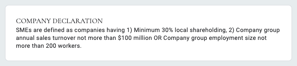 企业至少拥有30%的本地股权,公司集团的年销售营业额不超过1亿新币,或公司集团的雇用人数不超过200名工人。