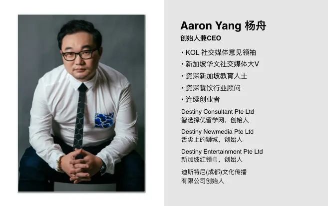 杨舟先生,是一位新加坡本地华人社交圈的网红,早年留学新加坡,因为亲身经历的影响,白手起家,打造互联网留学平台智选择优。在10年时间内连续创业了3家公司和5个品牌,从留学教育到新媒体,从美食到娱乐,创造“马斯诺理论海外华人需求金字塔”从各方面影响着新加坡新移民的生活。