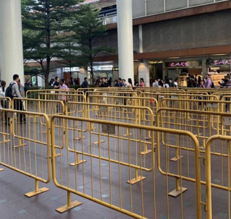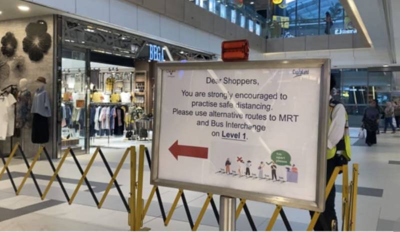 有的只开放一个出入口,比如裕廊西的jurong point 便在商场门口摆放围栏,进入商场的人都需要排队进入。