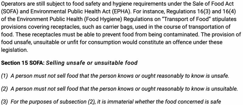 根据《食品销售法》(SOFA)和《环境公共卫生法》(EPHA),运营商仍需遵守食品安全和卫生要求。