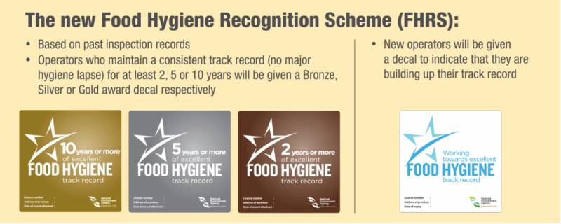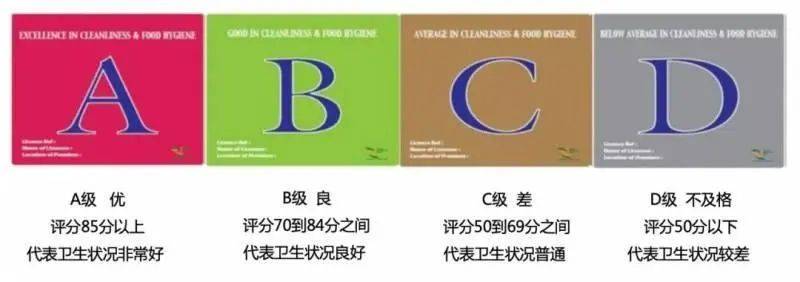 其将新加坡所有餐饮商铺的卫生情况分:A(优)、B(良)、C(中)、D(差)使用红、绿、褐、灰进行标识,一年一度按突击检查评估得分而定。