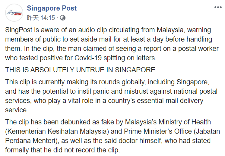 这段音频来源自马来西亚,目前已经在其他国家疯传,尤其是在新加坡。而刚好近段时间,新邮政中心成为新加坡的一个新感染源,因此更引起网友们的担忧。(注:目前确诊病例中并没有邮差) 就此事,Singpost昨天中午已在社交媒体Facebook上作出回应。