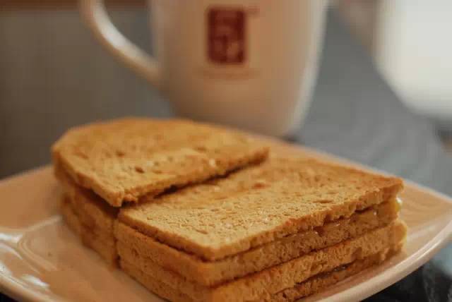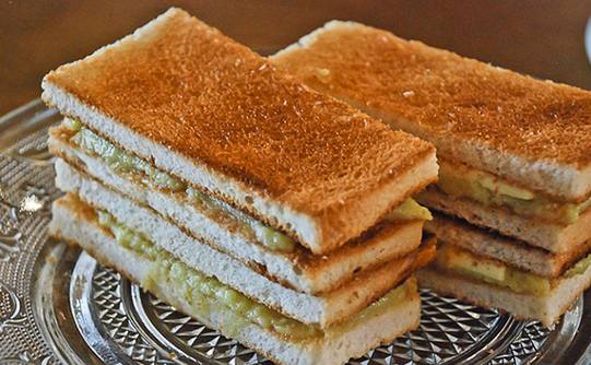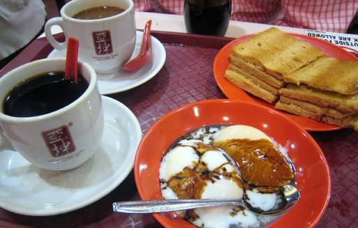 特制的巧克力吐司碳烤后,抹上咖椰(Kaya)和牛油等果酱,创造出独特的风味小点。咖椰酱是一种由鸡蛋和椰奶手工调制的果酱,让松脆的吐司咬起来透著香甜,搭配茶、咖啡或者一碗半熟的鸡蛋,就是地道的新加坡式早餐。