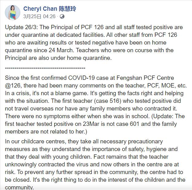 我也要借此机会提醒所有新加坡人对社会负责。我们父亲没有前往受影响的国家或地区。他是如何被感染的,对我的家人仍然是个谜。让我们通过对社会负责任的方式来纪念锺爸爸。可以避免由于社会不负责任的行为而造成的另一种损失!