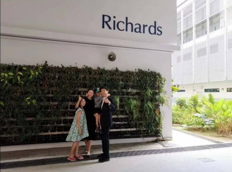 乐赛小学有一栋楼的名字正好是弟弟的英文名,一家人开开心心“拍照纪念到此一游”