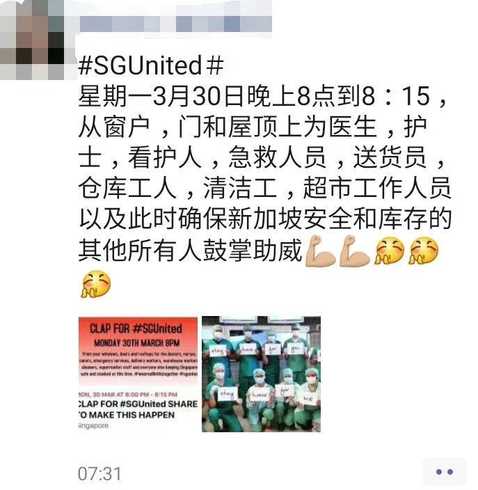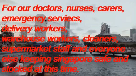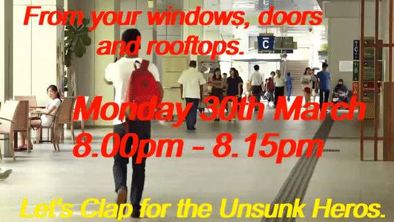 今晚8点-8点15分,请你从窗户,门和屋顶上,为医生,护士,看护人,急救人员,送货员,仓库工人,清洁工,超市工作人员以及此时确保新加坡安全和库存的其他所有人鼓掌助威!