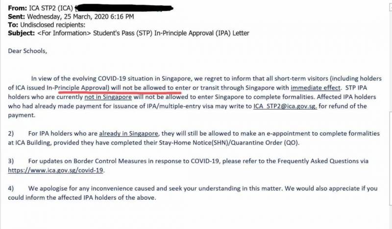 受COVID-19疫情影响。我们很遗憾的通知大家,所有短期访客(包括IPA持有者)将不再被允许入境和过境新加坡。现在身处新加坡境外的学生签证IPA持有者将不再能入境新加坡完成学生签证办理手续。如果他们已经支付相关费用,可以邮件ICA学生签证负责人进行退款。