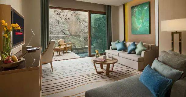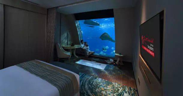 上层设有按摩浴缸、开放式客厅与室外露台,下层为绚丽海底景观,40,000多种海洋鱼类在眼前自由游弋,点缀舒适隐密的个人空间。