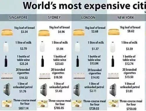 2015年,新加坡被经济学家杂志评为世界上生活成本贵的城市。在上图中你可以看到,新加坡的面包和牛奶价格比伦敦还要贵,烟酒被政府课以重税,汽油价格比纽约更贵,而去饭店就餐的价格全世界较高。