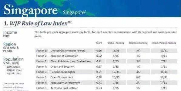 那么新加坡的法律环境在全世界来讲属于什么程度呢?新加坡在全球法治指数中排名第十,在亚太地区仅次于澳大利亚。