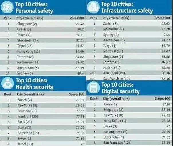 安全分类中,新加坡的人身安全(PersonalSafety)位列全球第一。基础建设安全位列第七,数据安全位列世界第二。相比之下,卫生系统安全则比较落后,没有进入前十。