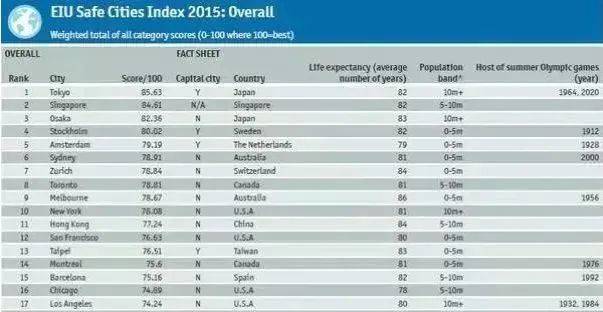 据经济学家杂志(Economist)在2015年的一项研究得出的世界较安全城市排名中,新加坡位列第二,仅次于东京。