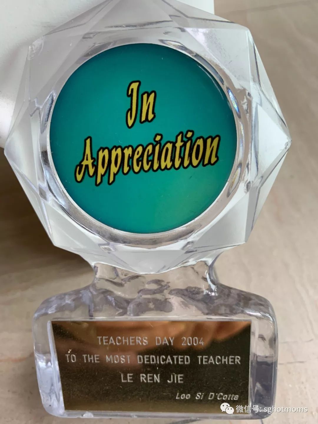 公教中学颁发给Vivien最有奉献精神老师奖