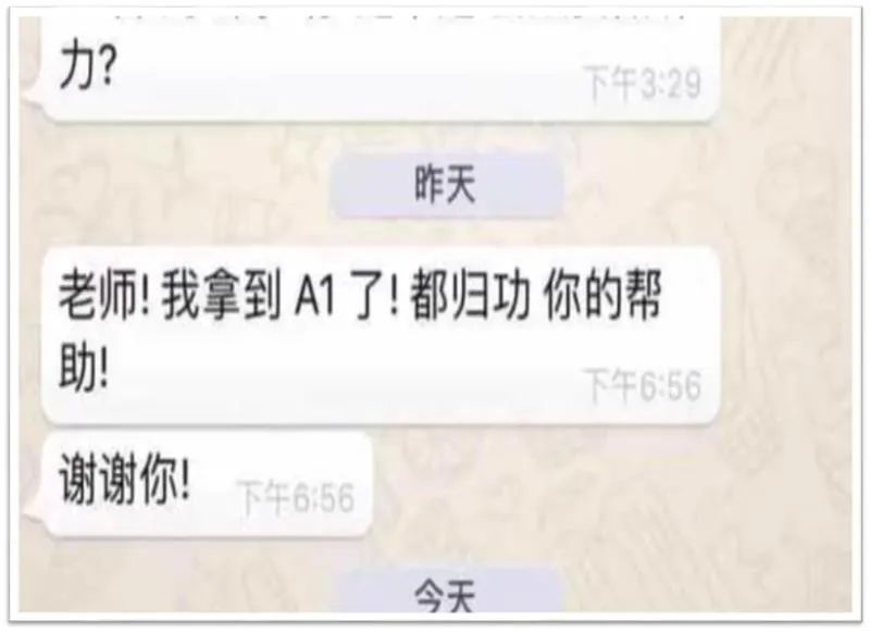 在老师的帮助下,孩子从不及格考到A1,兴奋无比地给老师发信息汇报好消息~
