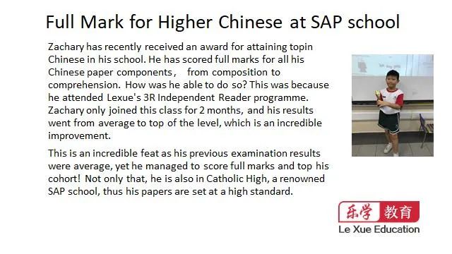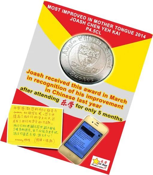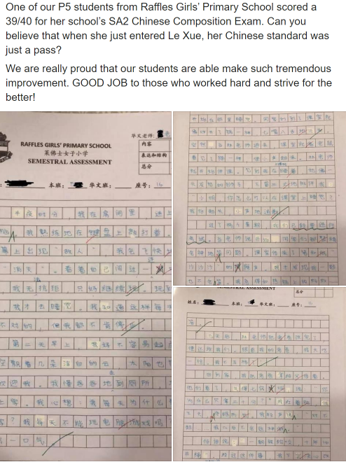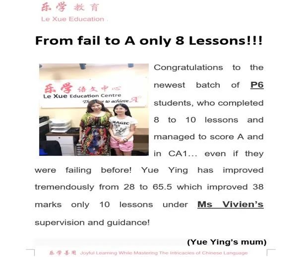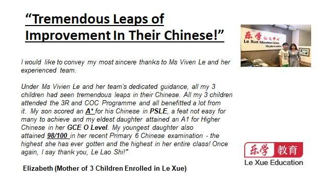 因为信任,许多家长家里所有孩子都送到乐学来上课。这位妈妈说,我的三个孩子都送到乐学补习华文,儿子在PSLE华文考到A*,大女儿O水准考到A1,小女儿今年P6,年中考试取得了98分(满分100分)全班第一的好成绩。