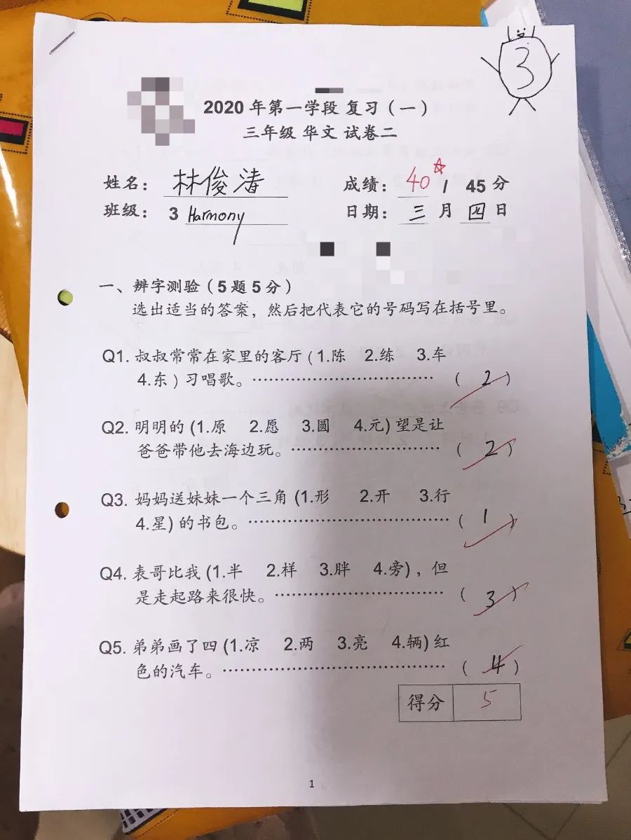 P3第一学期Emerson的华文考试成绩