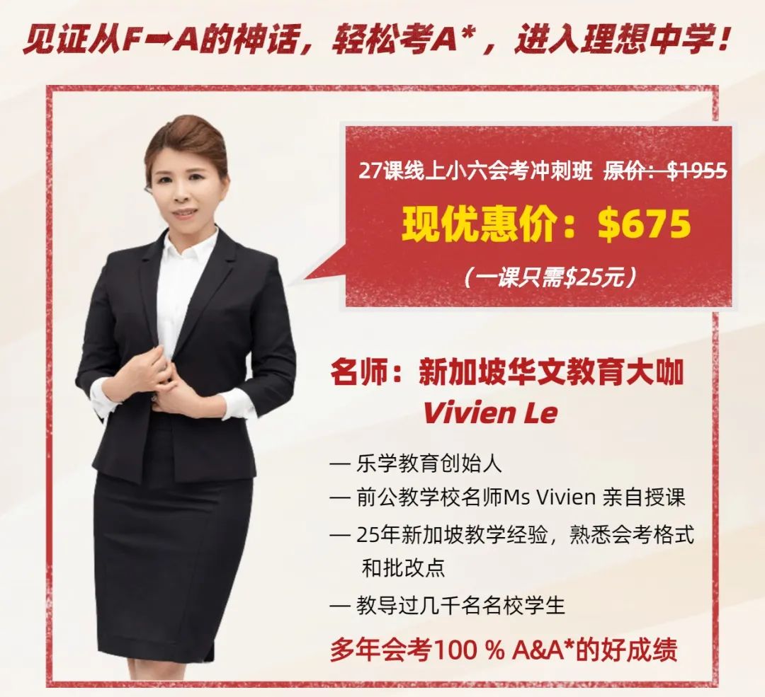Vivien老师还根据25年名校教学经验,整合了PSLE作文秘笈,理解问答技巧。这些都将在此次的网络冲刺班中,分享给所有的学生。