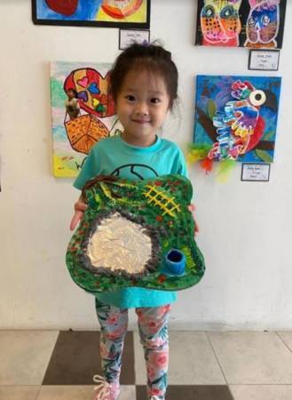王欣出示爱女手绘图与工艺品,色彩斑斓、想像力丰富,小小年纪天分佳,王欣赞是学校教得好。