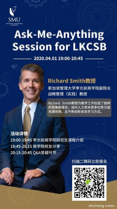 今晚19:00-20:45 李光前商学院副院长 Richard Smith 教授 将“空降”微信群, 为同学们分享商学院研究生课程信息(英文), 更有李光前商学院校友经验分享。 对研究生课程有任何问题的同学, 也可借此机会与教授云上沟通。 欢迎同学们扫描下方图片中的二维码添加小新, 小新将在活动前将同学们拉入讲座群, 小新等你们哦~