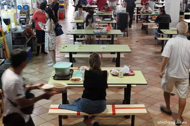 3月28日,在新加坡武吉士小吃集市,餐桌的座位上贴上红色胶纸,提醒人们进餐时保持距离。(新华社发,邓智炜摄)