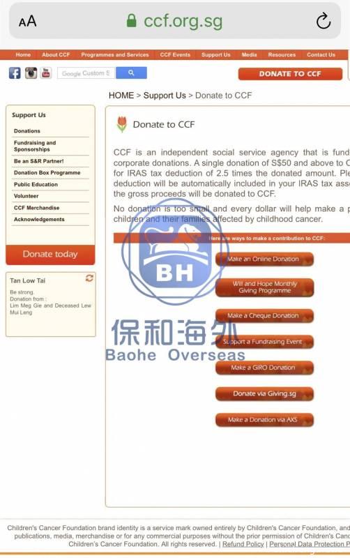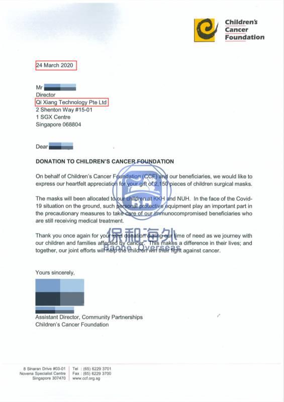 保和代客户给新加坡儿童癌症基金会捐赠的口罩